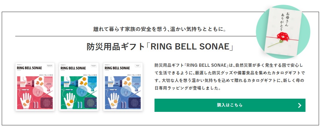 リンベルでは離れて暮らすご家族の安全を想うギフトとして防災用品ギフト「RING BELL SONAE」も人気です。